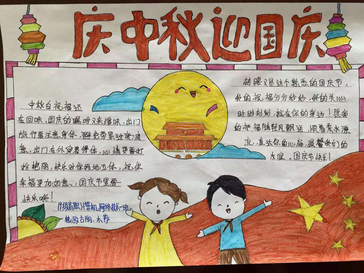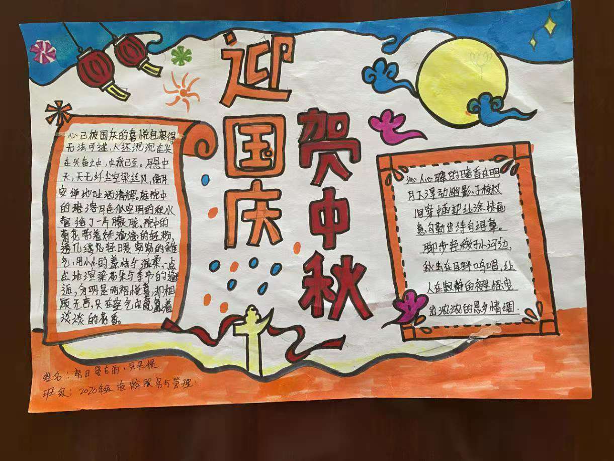 全院学生积极参与,他们围绕“爱我中华”、“喜迎中秋”、“双喜临门”等一个个鲜明的主题,用心搜集资料、自主设计版面。整个手抄报展览布局合理、色彩鲜明、内容丰富、构思新颖,展现了同学们积极向上的精神风貌,表达了对祖国的热爱和对亲人的思念,诠释了中秋节的由来、风俗习惯等传统文化。