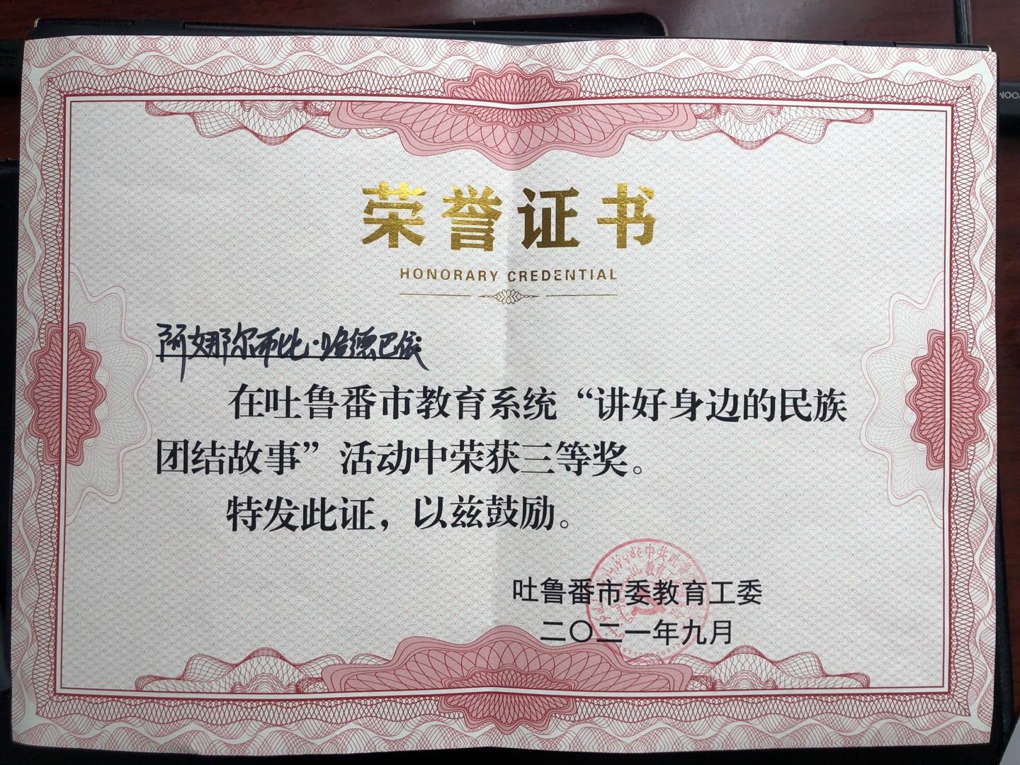 我校一名学生在吐鲁番市教育系统“讲好身边的民族团结故事”活动中荣获三等奖!