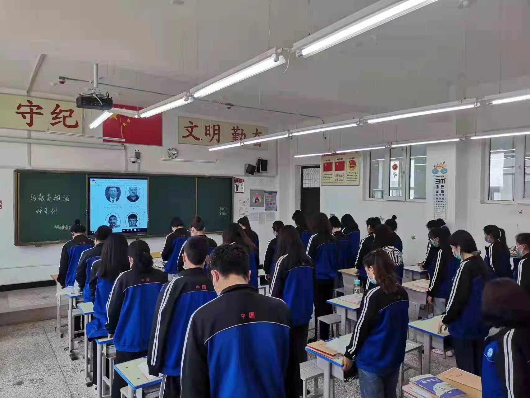 在老师和班委的带领下各班学生默哀3分钟,表达对英雄的敬仰和哀思。随后浏览英烈典型事迹,在图片下方点击献花和爱心。同时大家踊跃学事迹、谈感想,通过发表感言、学习革命先烈事迹等形式,向为国家和民族付出毕生心血、献出生命的老一辈革命家、革命先烈、人民英模表达敬意,写下奋斗共圆中国梦的美好心愿。